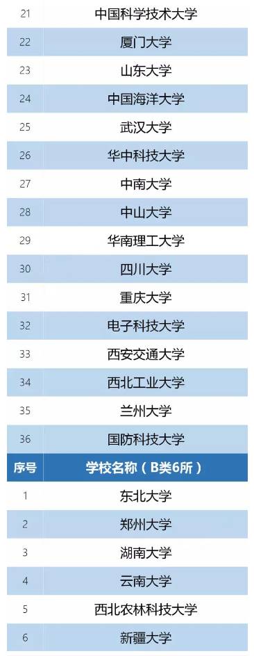 B类分两种,一种是被“降级”的985大学:东北大学、湖南大学、西北农林科技大学。