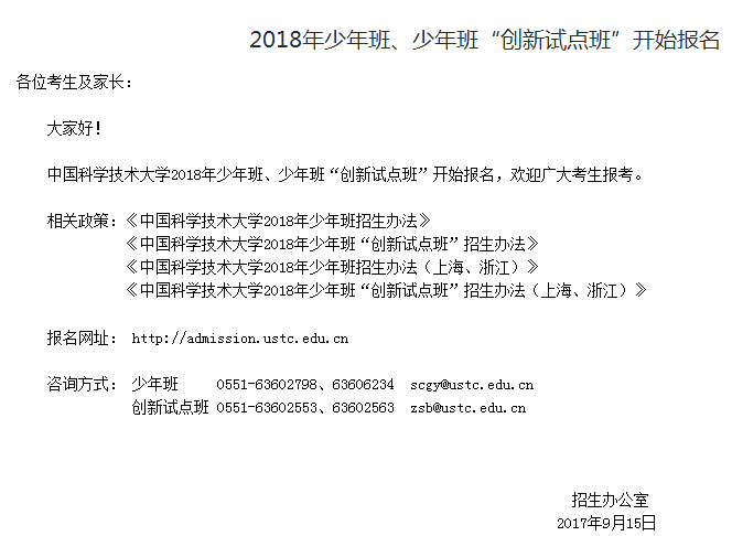 中国科学技术大学2018年少年班、少年班“创新试点班”开始报名